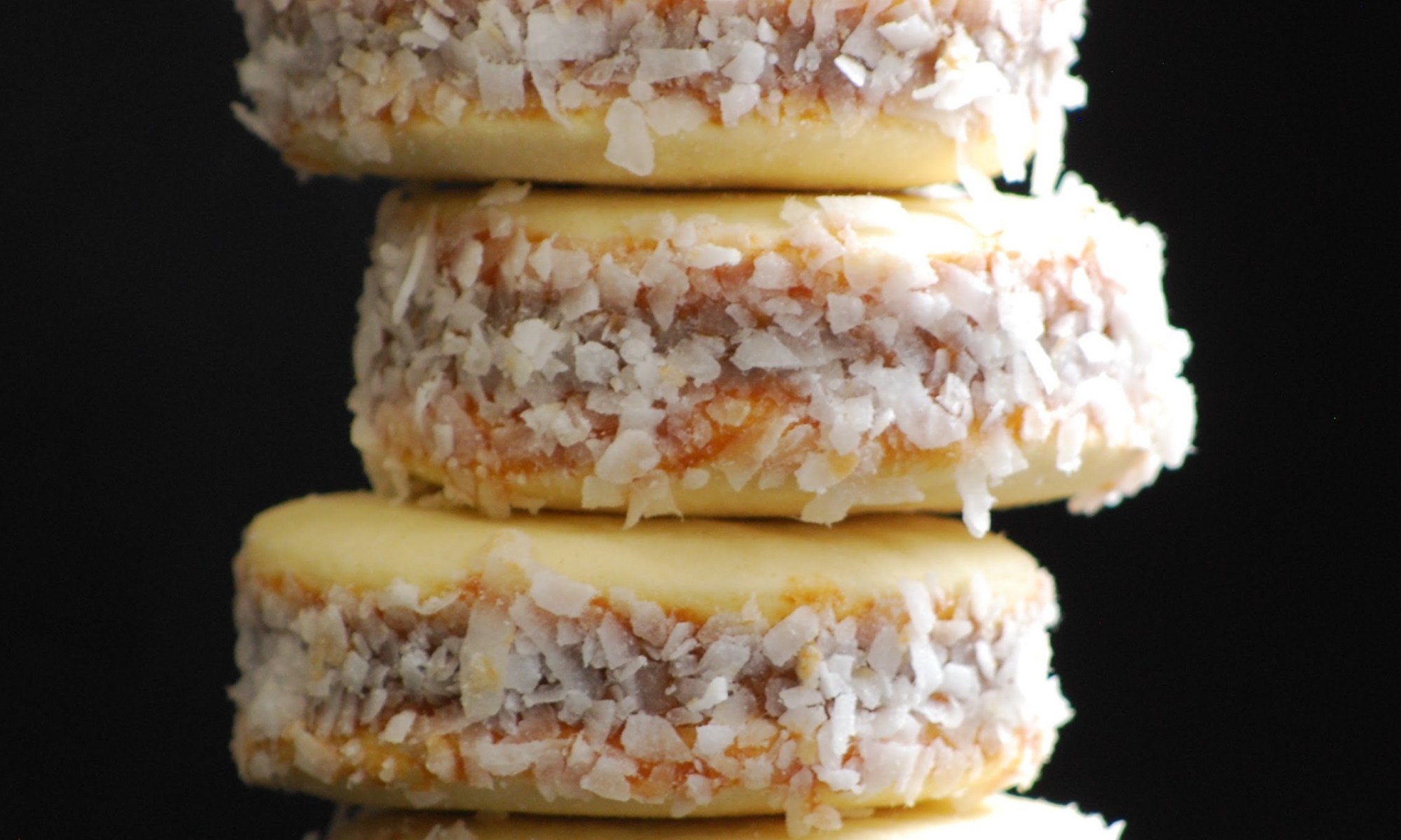two corn starch flour cookies filled with dulce de leche with grated coconut around